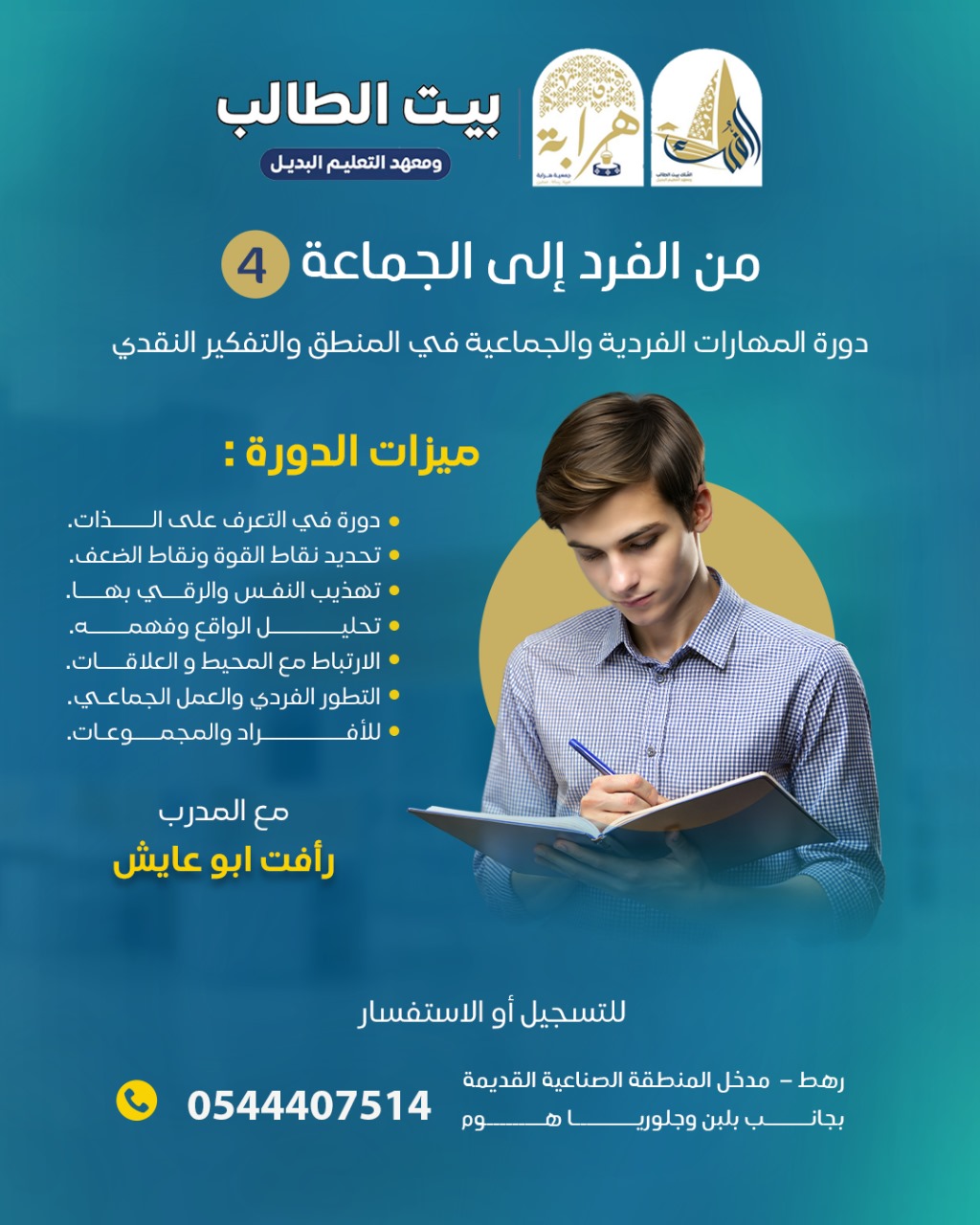 في بيت الطالب – رهط نحرص دائمًا على تقديم أحدث البرامج والدورات التدريبية التي تلبي احتياجات الطلاب والشباب وتساعدهم على تطوير مهاراتهم واكتساب خبرات عملية وحياتية.